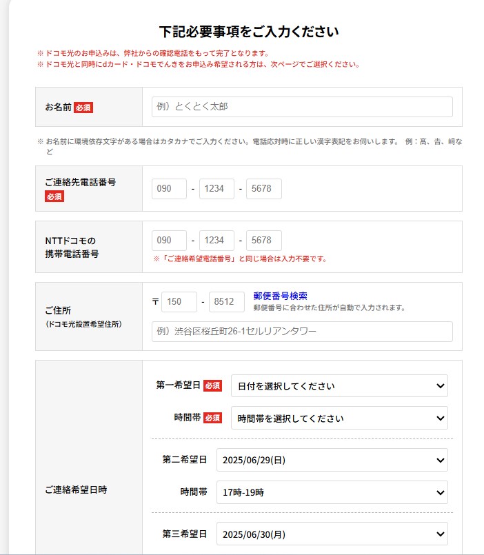- ③入氏名、携帯電話、住所、第一〜第三希望日とメールアドレスを入力