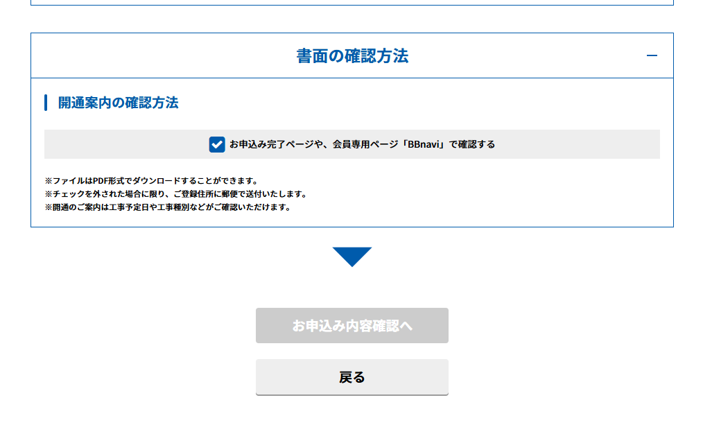 全ての入力がクリアすれば、上記の開通案内の確認方法をチェックした上でお申込み内容確認へのボタンを押します。