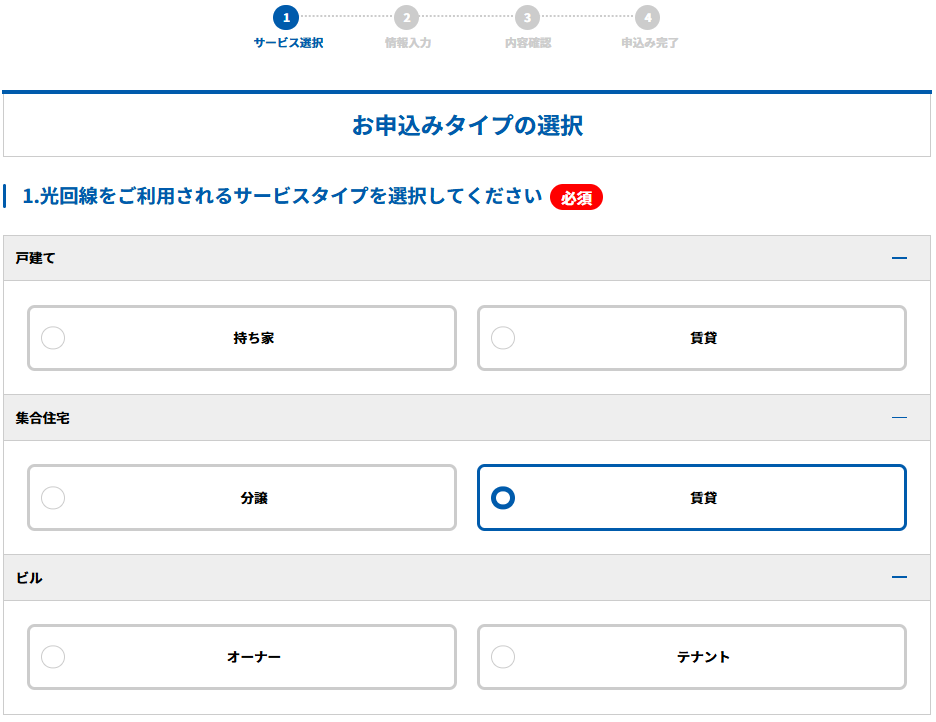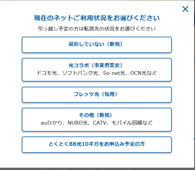 最初に、回線の種類や住居タイプ、オプションを選びます。