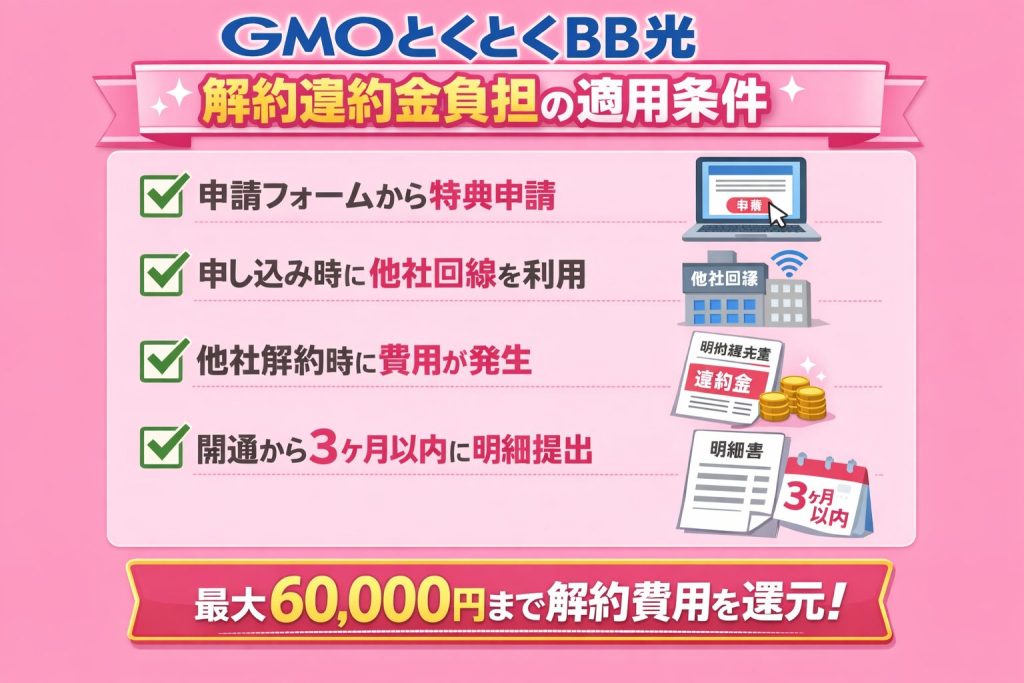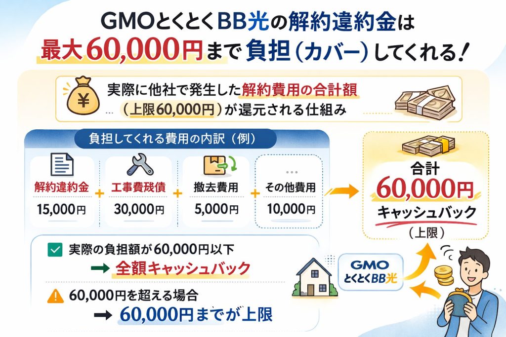 なぜなら。GMOとくとくBB光には他社の解約違約金を負担する特典(最大60,000円のキャッシュバック)があるからです。