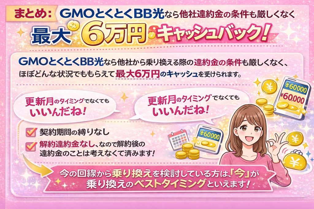 まとめ:GMOとくとくBB光なら他社違約金の条件も厳しくなくほぼもらえて最大6万円!