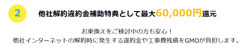 「他社インターネットの解約時に発生する 違約金や工事費残債をGMOが負担します」